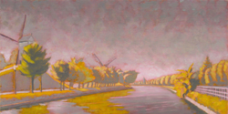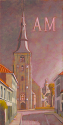 The Sint AnnaKerk piece is shifting towards purple now. This seems to be due to the combination received through the massive amounts of warm gray tints that I worked into the crimson lake (red) tint. The church was a lovely yellow but I decided it needed a darker more massive tonality in order to provide enough contrast and mass for the strong highlights on its right side. I used clear glaze to eliminate the red tint from most of the green areas. The composition does not have a lot of strong color statements, so it’s interesting to attempt to pull out whatever is possible.