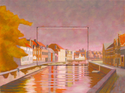 The Predijkherenrij Grande has a strong value composition containing a lot of colors. The red level was a marathon session of 14 hours, working the paints in before the medium dried. Applying the tint, erasing the same from the highlights and some greens and then building up the masses with (mostly) semi-opague tints of warm gray and lead white. Strong reds, yellows and oranges were restated with emulsified pigment. It feels quite hot now, doesn’t it?
