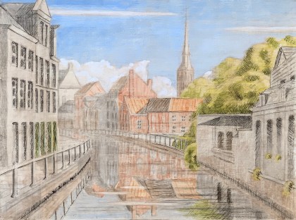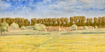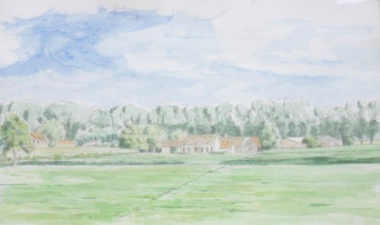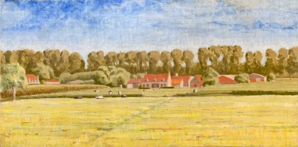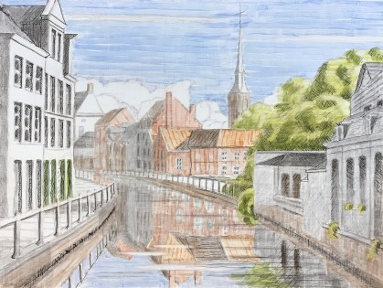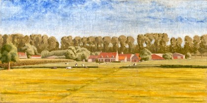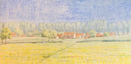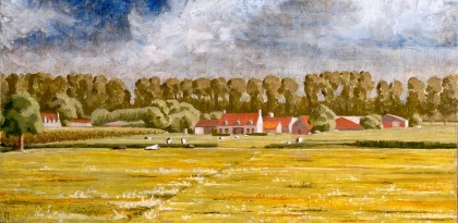 So I’ve been working on a landscape of a farm on the Dammevaart just outside of Bruges. I created a watercolor study of it a few years ago. This functions for the basic composition, color relations and light study.