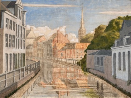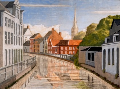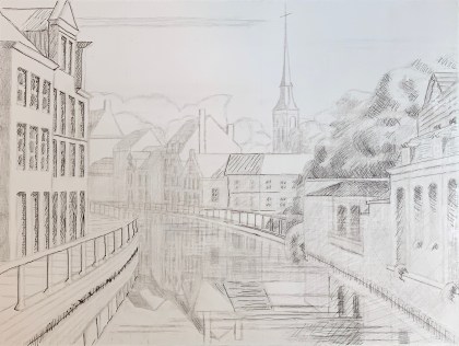 Sometime in 2012, I think, I was struck by the morning light as I crossed the bridge connecting the Langestraat to the Hoogstraat here in Bruges (where I live). So I did a value study of it, imagining that I would soon create a painting of it in the studio. Well, “soon” turns out to have been a bit longer. In the interim we renovated an outbuilding of our house so that I actually had a functional place to paint, but also, I returned to the university in order to attain a Masters degree in Western Philosophy @ KULeuven. That latter project turned out to be a five year hiatus from the studio(!). So now I’m returning now, clearing out old projects and beginning new ones.