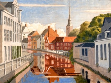Final layer of paint on the Vaardijk. Note the highlights of the green tree in the foreground, right and the building roofs on the right side of the canal. They are highlights reclaimed through painting backwards and/or light glazes.The highlights of the white building foreground, left, are a more impasto lead white.